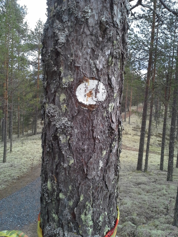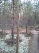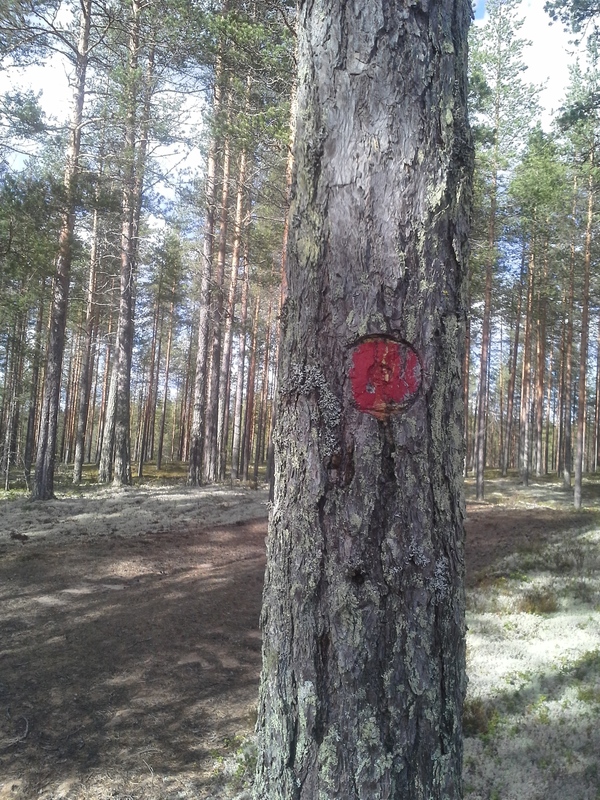Kolmannen huoltopisteen jälkeen alkaa punainen reitti. Merkit puissa tai puutolpissa.